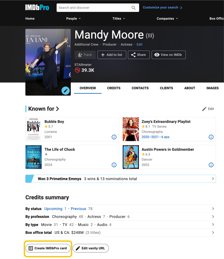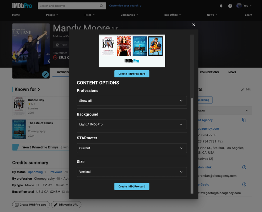 As an IMDbPro member you can use this feature to share your profile and promote yourself on social media. Use the card to showcase your profile image, professions, STARmeter rank and Known For titles. You can also share any other person's profile and with the latest update, you can create an IMDbPro card using the IMDbPro app or the desktop and mobile versions of IMDbPro. Learn more about the IMDbPro app